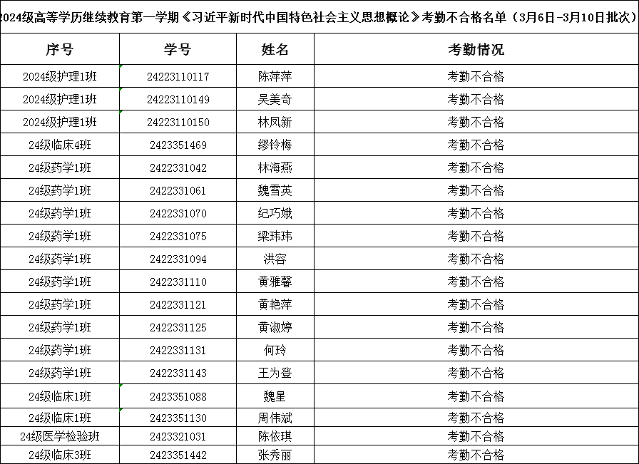 根据《福建卫生职业技术学院高等学历继续教育学生学 籍管理规定》(闽卫院继〔2021〕15号)第十条规定“缺勤累 计超过课程教学时数三分之一者,不能参加该学期课程的考 核”。经统计,3月6日—3月10日返校面授批次中2024级护理1班陈萍萍同学(已报到注册)上课考勤不合格,不能参加《习近平新时代中国特色社会主义思想概论》课程考核。