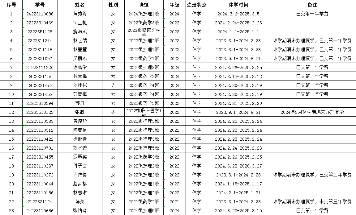 根据《福建卫生职业技术学院高等学历继续教育学生学籍管理规定》(闽卫院继〔2021〕15号)中“学生休学原则上以一学年为期。学生休学期间,保留学籍。休学时间不计入在校学习时间。学生在校期间只能休学一次”;“学生休学期满,应于学年或学期前一个月向学校申请复学”。黄秀铃等23名学生即将休学期满(名单详见附件),应于2025年3月20日前复学,并按流程办理复学审批手续。