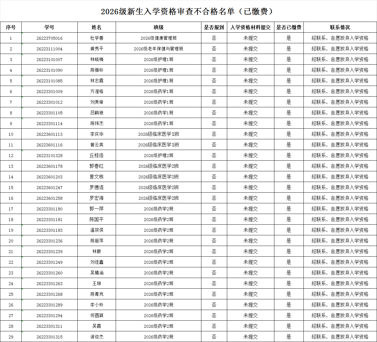 根据《福建卫生职业技术学院高等学历继续教育学生学籍管理规定》第一章第一条规定:“按高校学历继续教育招生统一考试录取的新生,入学时须持我校签发的《录取通知书》和有关证件,按学校有关要求和规定的期限到校办理入学手续。因故不能按期入学者,应以书面形式向继续教育学院提出延迟入学申请,延迟时间一般不得超过面授学时的1/3。未申请或者申请逾期者,除因不可抗力等正当事由外,视为放弃入学资格。”经班主任联系确认、学院核查,2026级杜学善等29名录取新生逾期未办理入学手续(具体名单见附件),未提交入学资格审核材料,现将相关情况予以公示。请相关学生从即日起5日内与本校继续教育学院联系,办理退费手续。