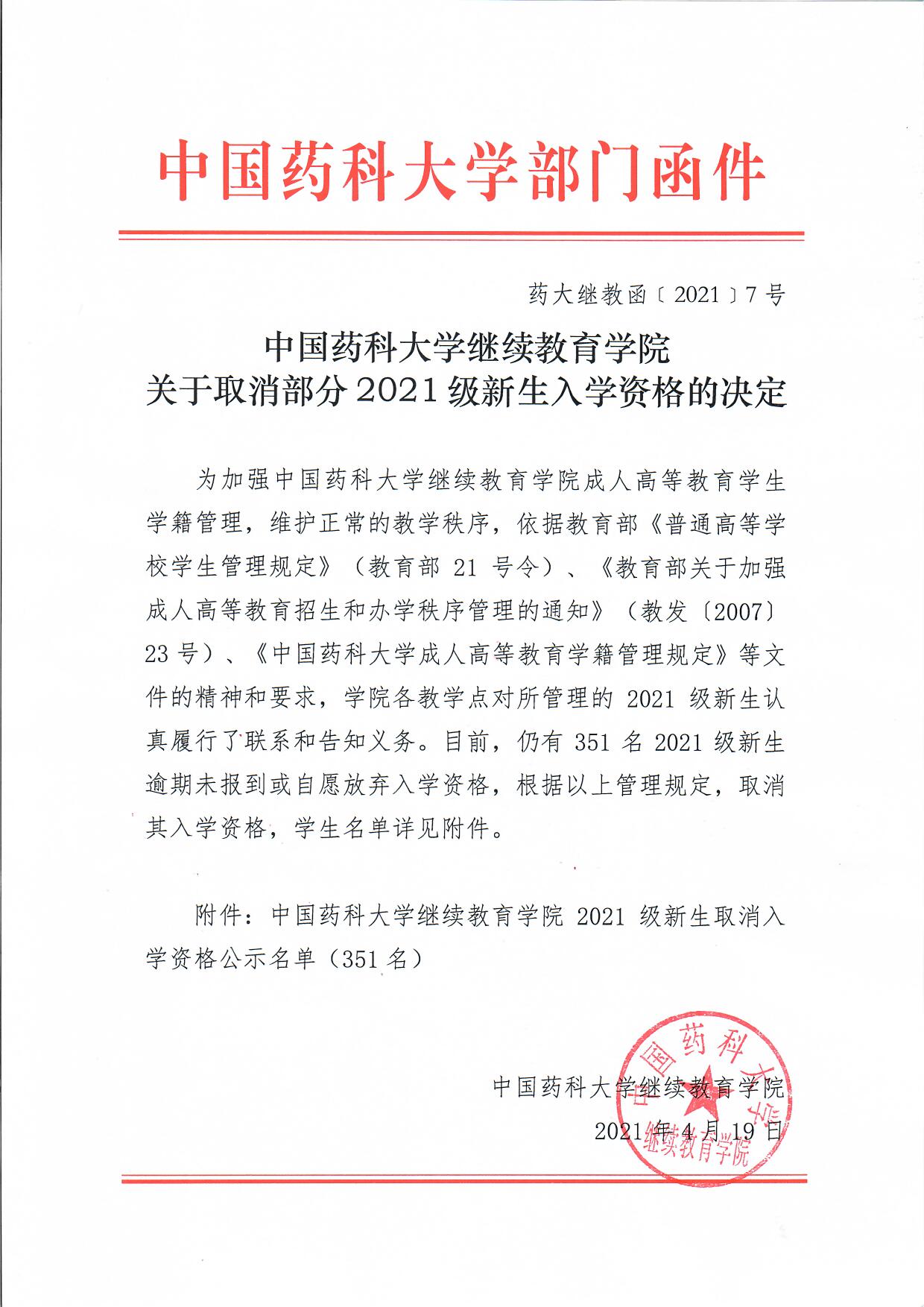 中国药科大学继续教育学院关于取消部分2021级新生入学资格的决定,其中含福建函授站1人,具体名单见附件。