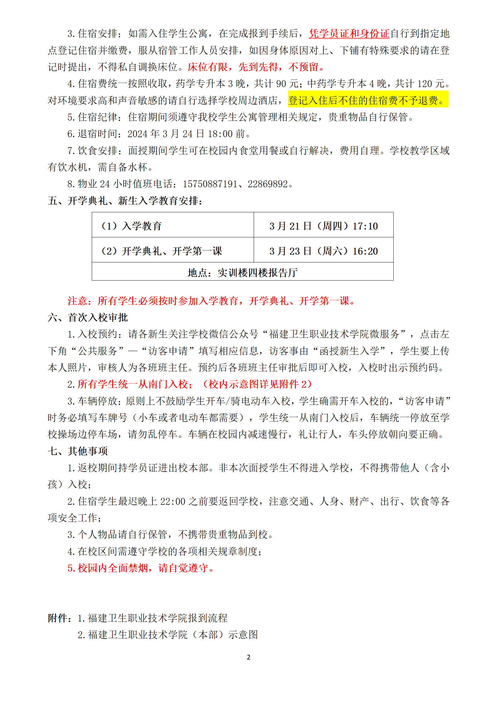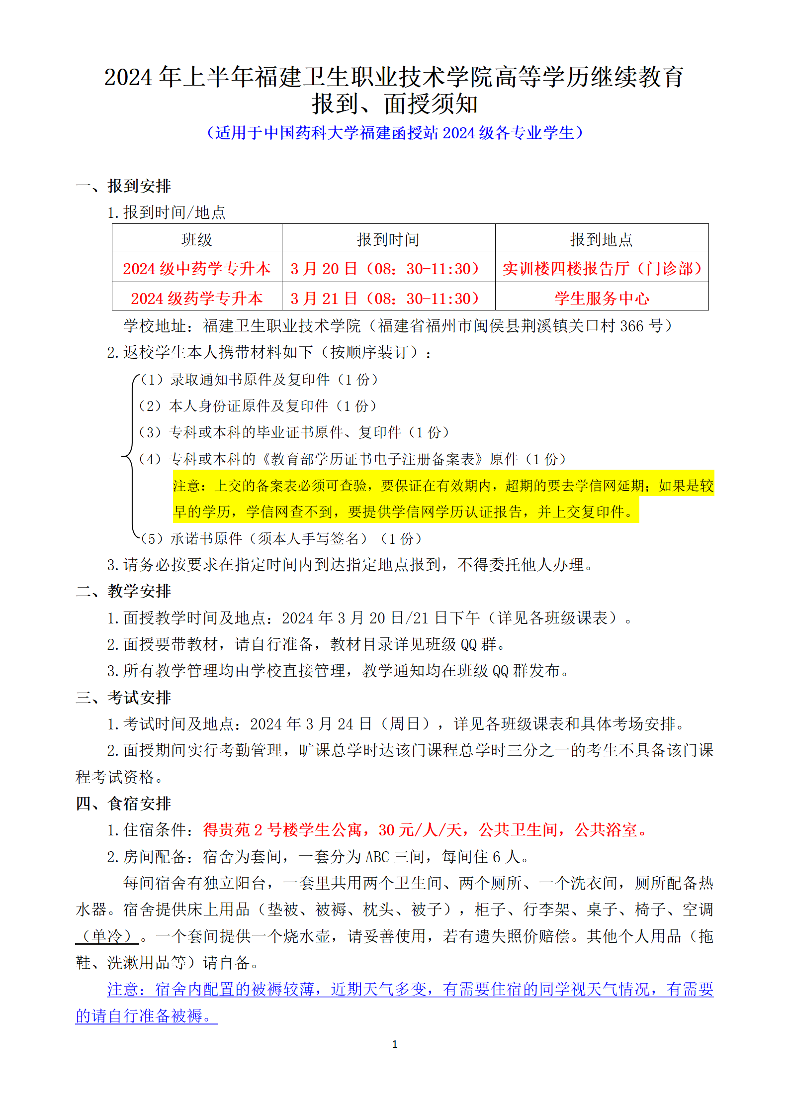 福建卫生职业技术学院高等学历继续教育返校面授须知(适用于中国药科大学福建函授站2024级各专业学生)