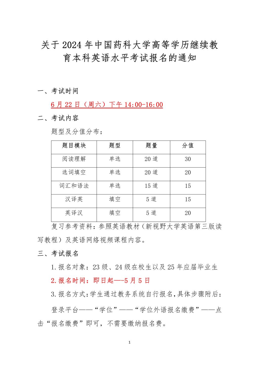 关于2024年中国药科大学高等学历继续教育本科英语水平考试报名的通知