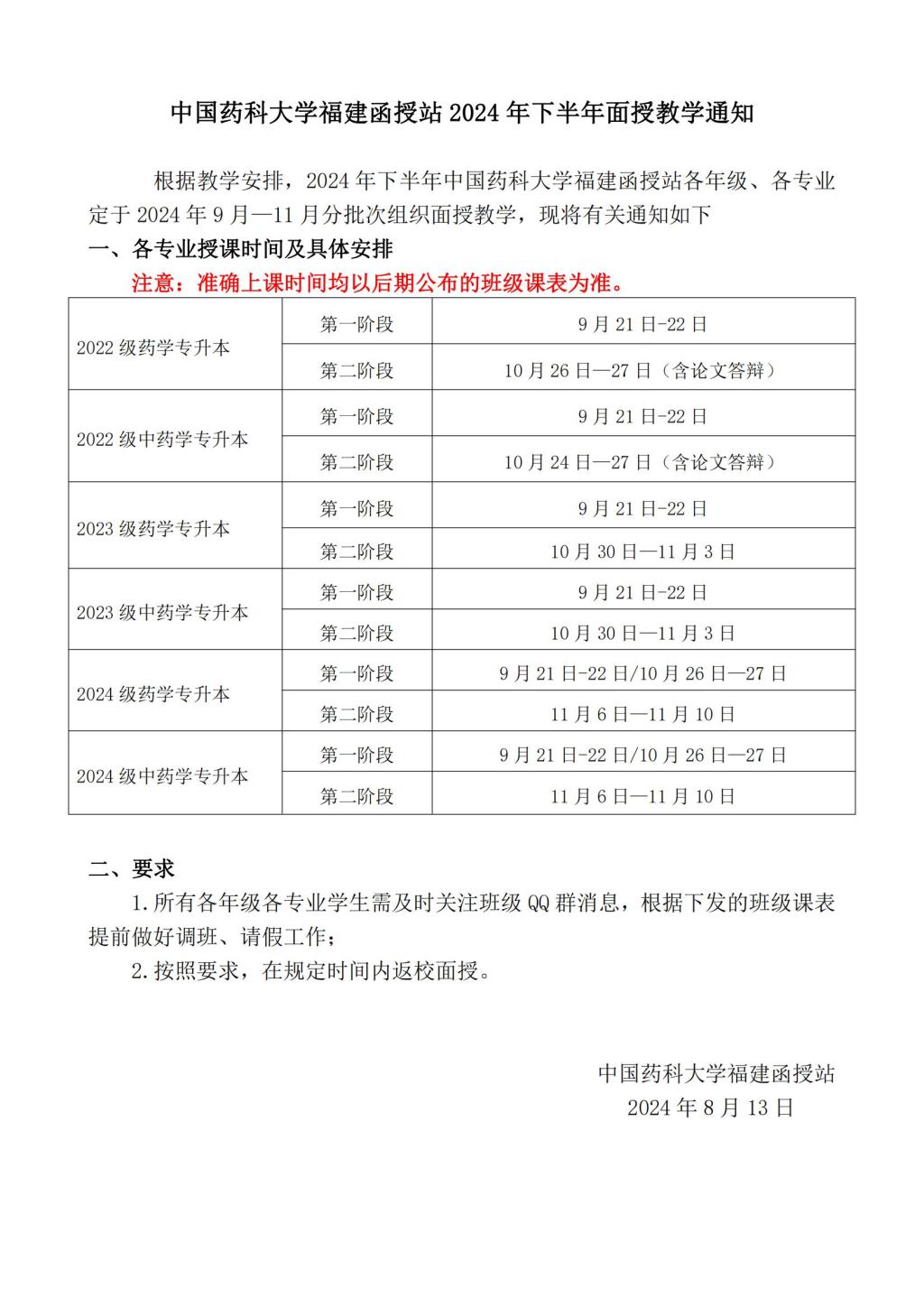 中国药科大学福建函授站2024年下半年面授教学通知