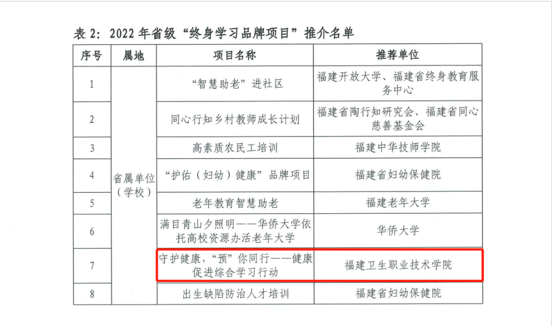 近日,福建省终身教育促进委员会公布2022年省级“百姓学习之星”和“终身学习品牌项目”推介名单,我校健康管理系申报的项目《守护健康,“预”你同行——健康促进综合学习行动》 被认定为2022年省级“终身学习品牌项目”。