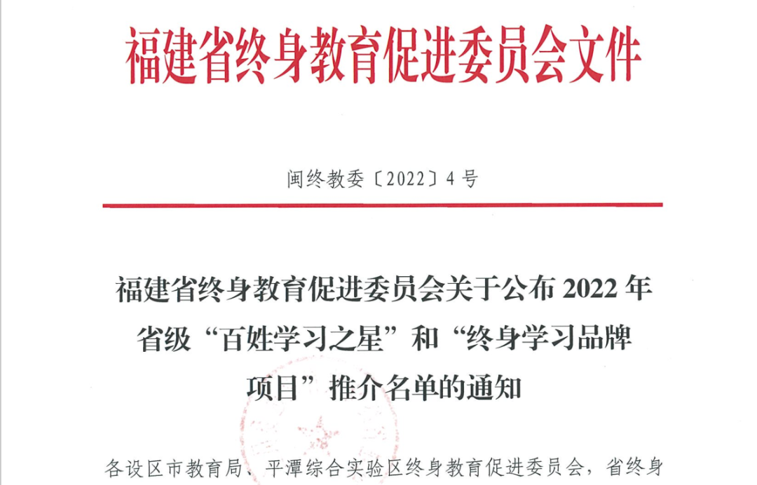 “终身学习品牌项目”是教育部全民终身学习活动周的重要内容,也是福建省营造终身学习氛围、建设学习型城市的重要体现。活动旨在为助力构建服务全民终身学习教育体系、加快建设学习型社会、大力提高国民素质提供示范引领的典型。经过专家综合评议,全省共评选出“终身学习品牌项目”42个,“百姓学习之星”58个。