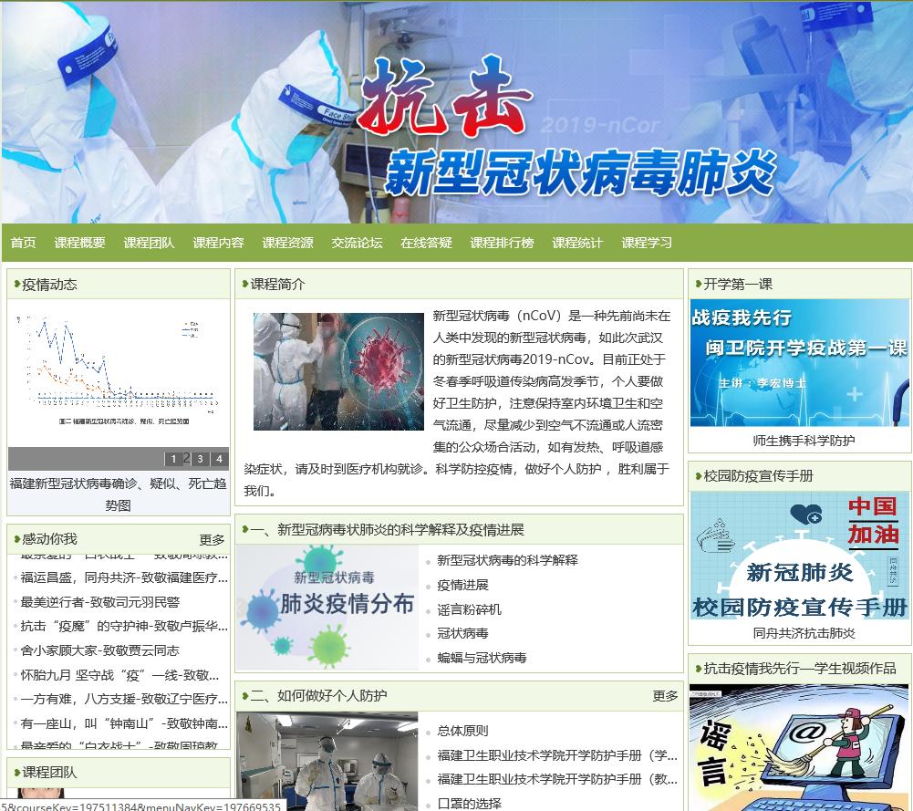 为贯彻落实教育部“课程学习与疫情防控知识学习相结合,特别注重疫情防护知识普及,加强生命教育、公共安全教育和心理健康教育”工作指示,福建卫生职业技术学院管理系党总支第一党支部教师党员联合预防医学教研室,利用预防医学专业优势,面向校内学生,在学院“天使之城”学习空间开设《抗击新型冠状病毒肺炎》网络课程。