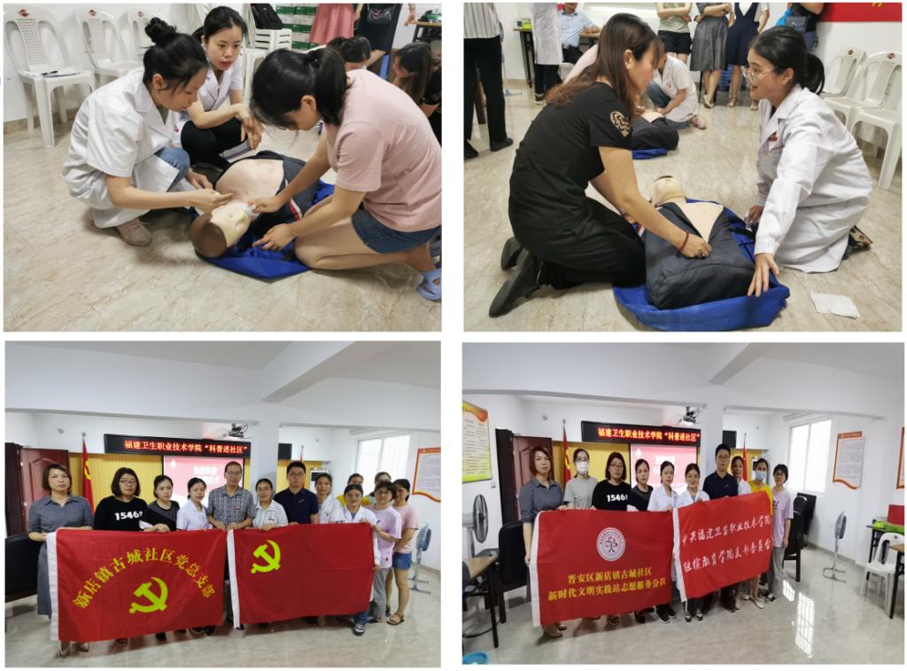 为扎实推进全民科学素质行动,弘扬科学精神,普及科学知识及医学急救常识,2021年5月27日,福建卫生职业技术学院继续教育学院党支部、医学系第三党支部、中医教研室、质量管理办公室党支部联合开展“科普进社区”——心肺复苏技能培训活动,在晋安区新店镇古城社区向居民普及医疗急救知识和现场处置能力,提高居民应急意识、知识和技能,让更多居民在家门口就可以学到应急救护技能。