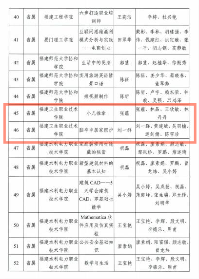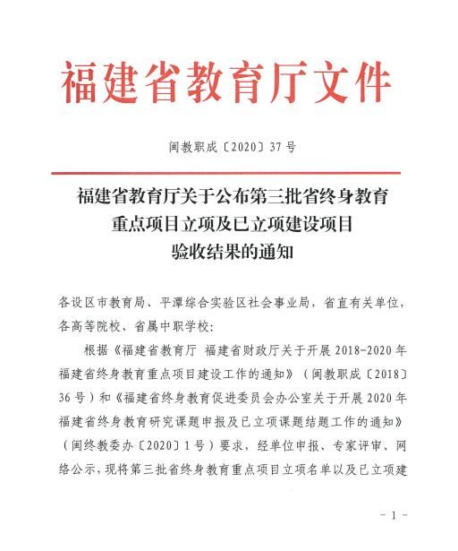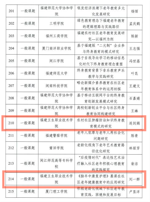近日,根据《福建省教育厅关于公布第三批省终身教育重点项目立项及立项建设项目验收结果的通知》(闽教职成〔2020〕37号),我校老年大学项目获批《福建省高校老年大学建设项目》;医学系张蕴老师主持的《小儿推拿》项目、护理学院刘一群老师主持的《脑卒中居家照护》项目入选省级继续教育网络课程;连剑娟老师主持的《农村社区肿瘤防治知识终身教育模式的研究》项目、刘一群老师主持的《脑卒中康复护理》慕课在社区老年健康教育中的应用研究项目入选终身教育研究课题。特此祝贺!