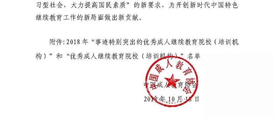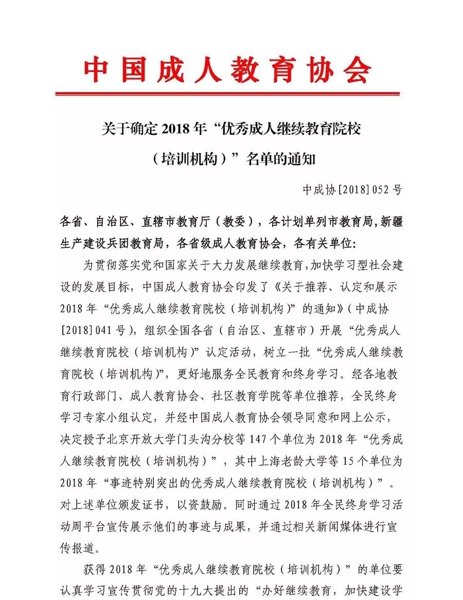 近日,中国成人教育协会发布了《关于确定2018年“优秀成人继续教育院校(培训机构)”名单的通知》(中成协〔2018〕052号),经各地教育行政部门、成人教育协会、社区教育学院等单位推荐,全民终身学习专家小组认定,全国147个单位被授予“优秀成人继续教育院校(培训机构)”,我院是福建省三个入选单位中唯一一所高职高专院校。