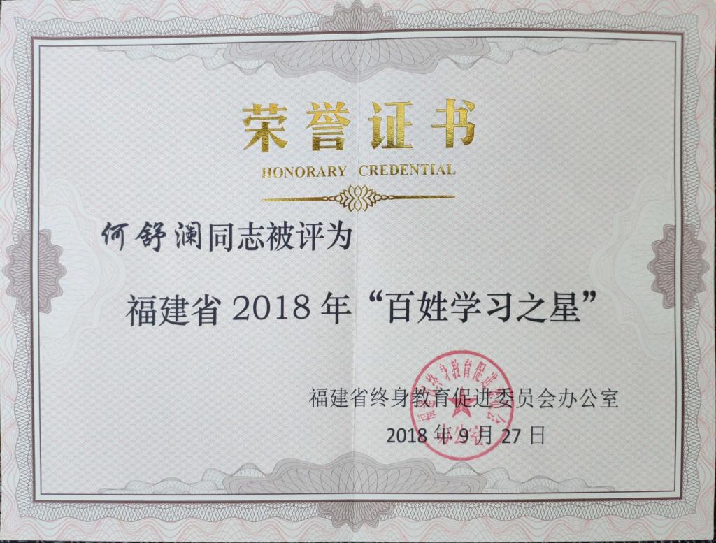 本次“百姓学习之星”评选活动由福建省终身教育促进委员会主办,经全省各单位推荐,层层筛选,专家最终评选,我院何舒澜同志最终入围。何舒澜老师秉承终身学习理念,刻苦钻研业务,把学习、工作与创新有机结合。将所学知识技能贯穿于教书育人,积极指导学生参与技能竞赛、社会实践、社团等活动。将所学知识技能服务于社会,积极参与党日活动、社区服务、三下乡等活动宣讲和传播中医药养生知识。近年来,该同志获国家级奖项5项、省级奖项11项、院级奖项9项。