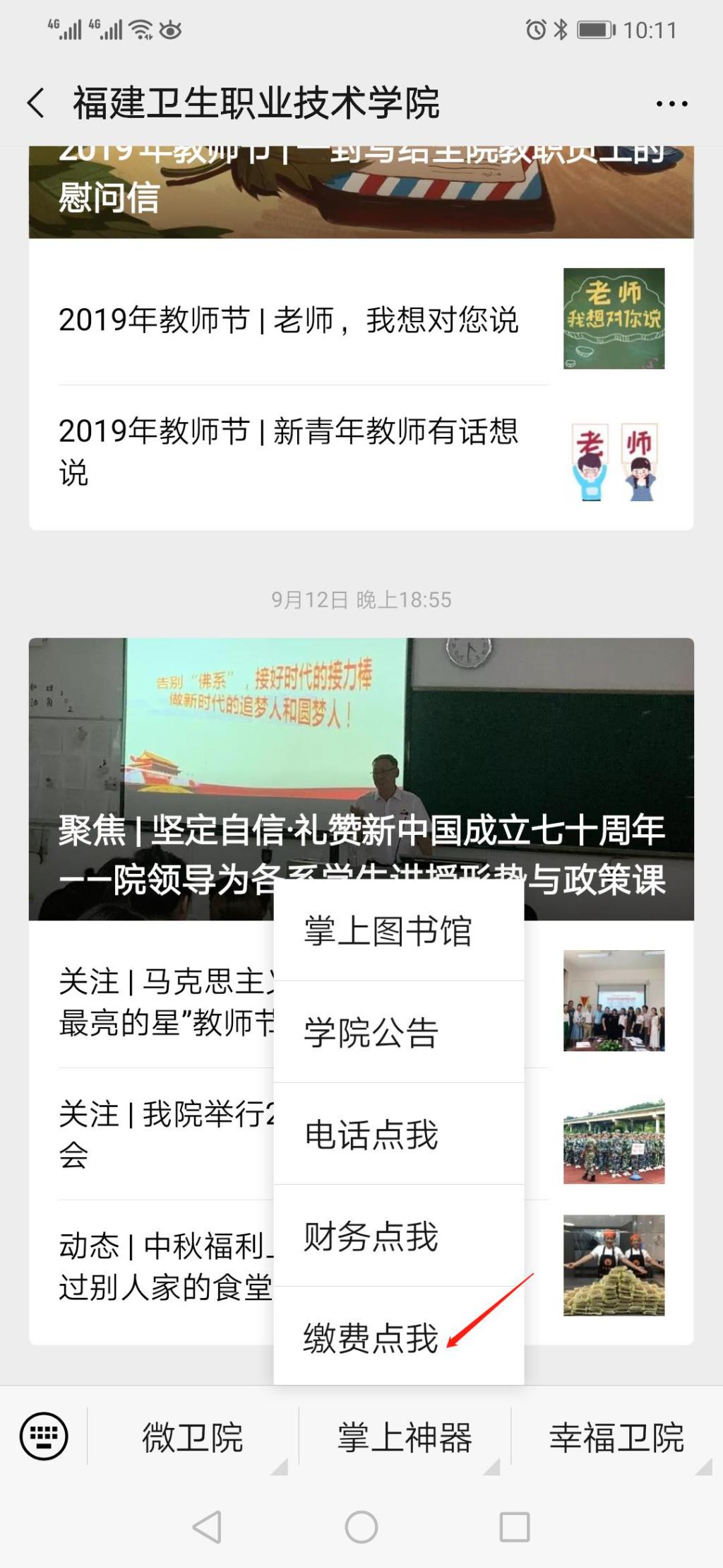 步骤1 关注“福建卫生职业技术学院”微信公众号后,点击下方“掌上神器”后再点击“缴费点我”。