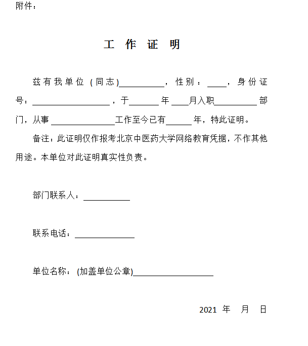 网上打印的报名表(须单位盖章签字、学生签字)、工作证明(见附件,须单位盖章)各1份;