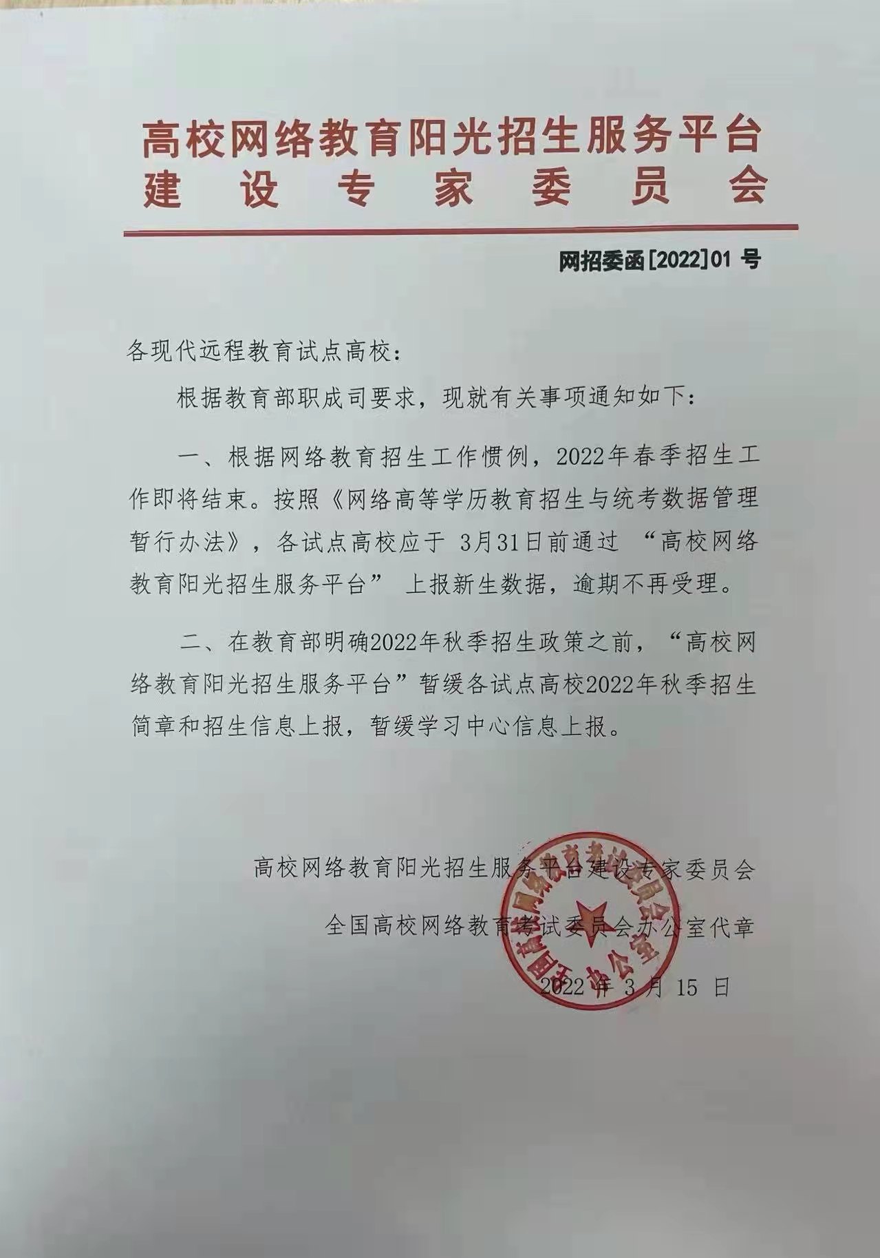 近日,北京中医大学接网考办通知,2022春新生上报数据日期仍为3月31日止,2022年秋季招生简章和招生信息在教育部明确秋季招生政策前暂缓上报,故继续教育学部将2022春季招生截止时间调整为2022年3月20日17点,请有意向报名的考生安排好报名时间。