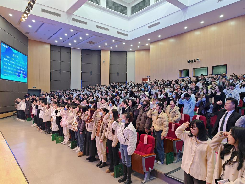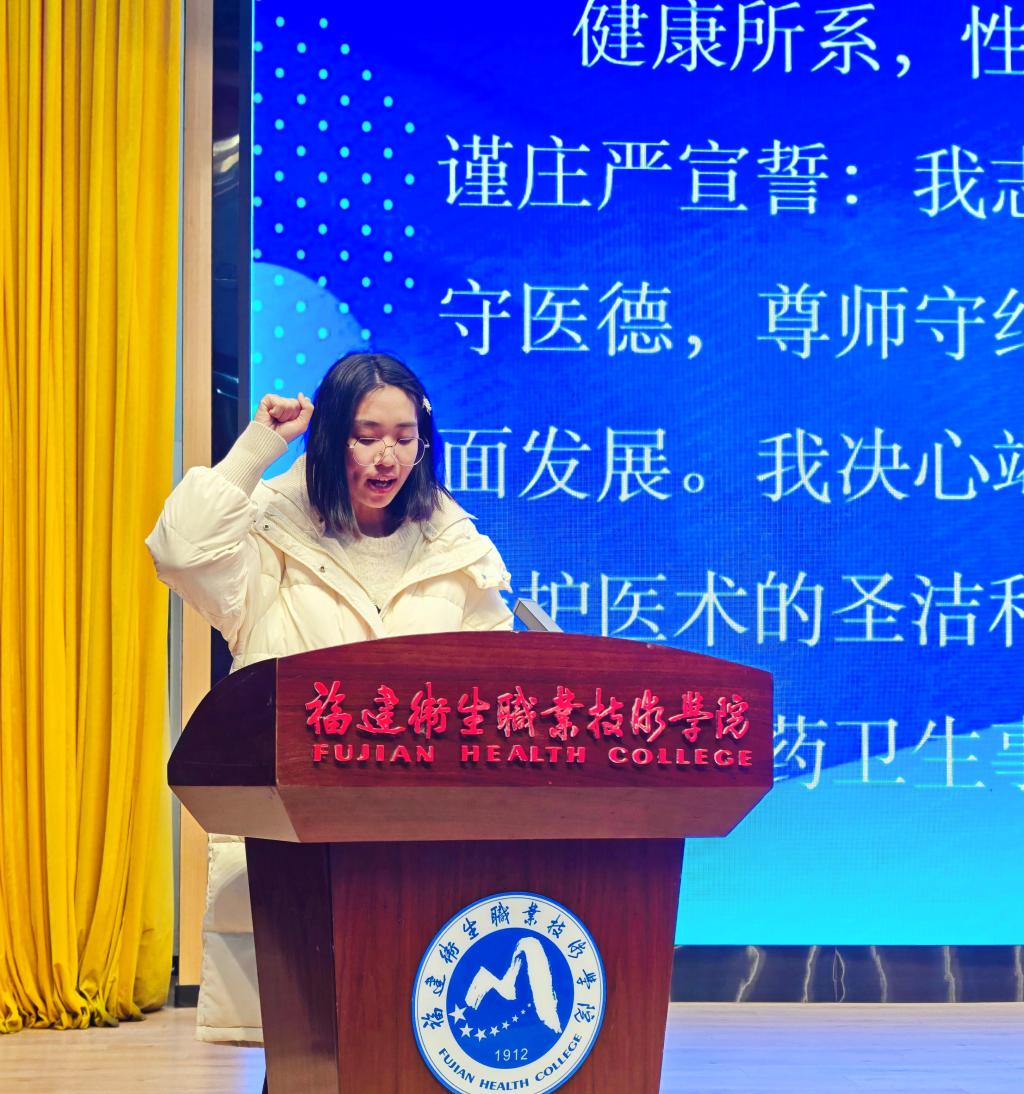典礼上,2022级护理4班饶柳芳同学带领全体毕业生重温医学生誓词。拳头紧握,誓言铿锵,表达了学子们不忘初心、践行新时代医药卫生职业精神的承诺。
