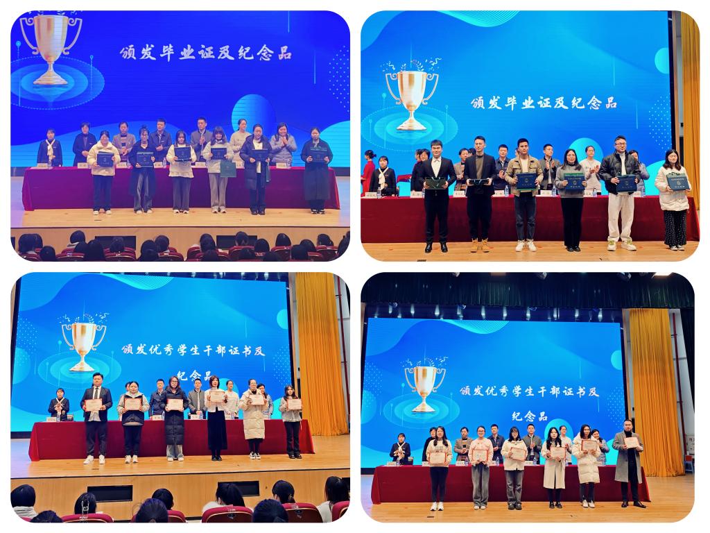 随后,与会领导分别为2025届各班毕业生代表颁发毕业证书和纪念品,为优秀学生干部代表颁发荣誉证书和纪念品。