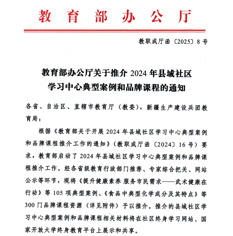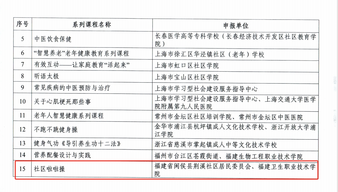 近日,教育部办公厅公布2024年县域社区学习中心典型案例和品牌课程推介名单。由我校体育部余照铖老师主讲,与闽侯县荆溪社区居民委员会联合申报的《社区啦啦操》课程,凭借创新的课程设计与显著的社会效益脱颖而出,成功入选“2024年县域社区学习中心品牌课程”。这不仅彰显了我校在社区教育领域的积极探索与实践成果,也展现了教师团队深耕基层教育的专业实力。