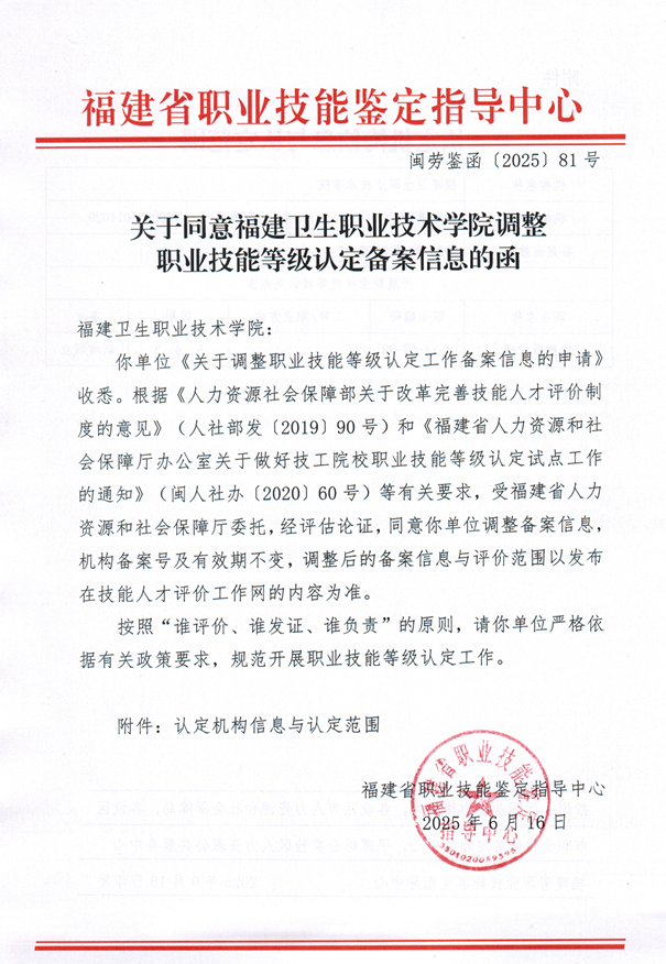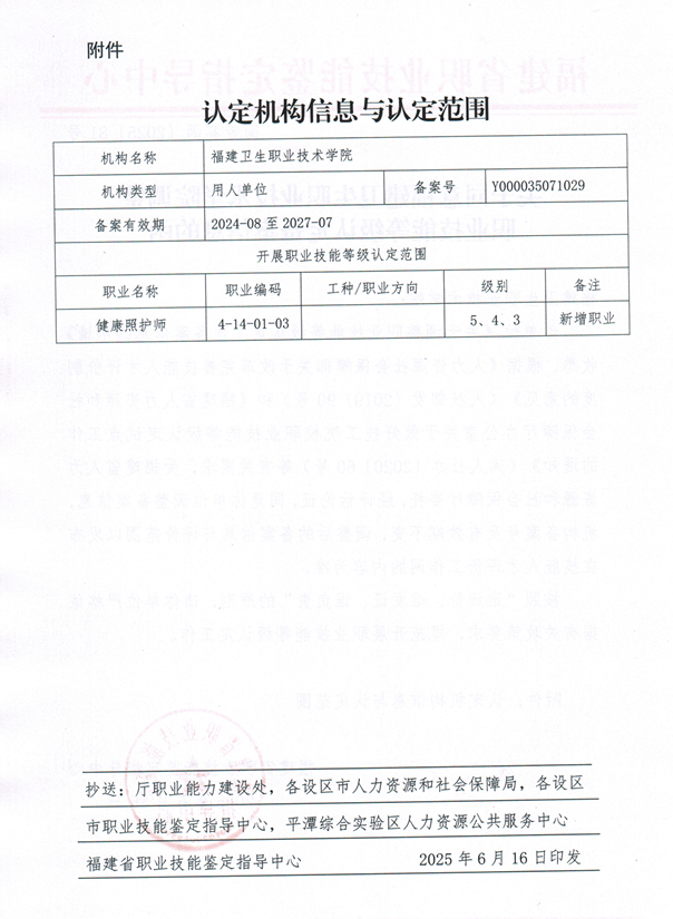 近日,我校成功通过福建省职业技能鉴定指导中心的严格审核并获批备案,正式新增“健康照护师”职业技能等级认定资质。标志着我校在职业技能人才培养领域迈出了重要一步,今后可向本校相关专业学生提供专业的健康照护师技能等级评价服务。