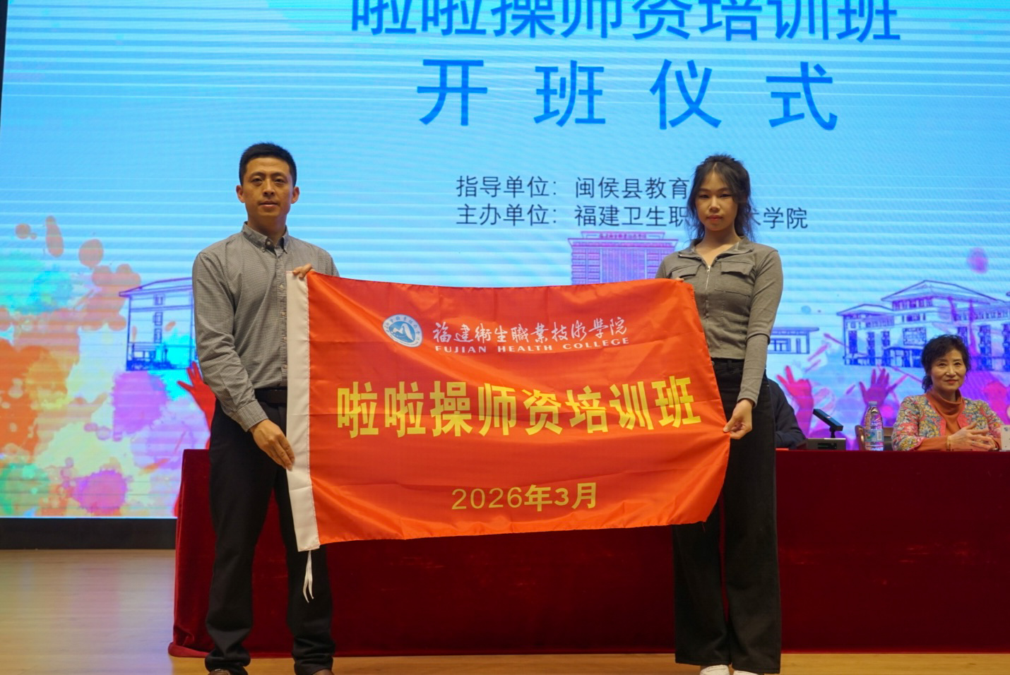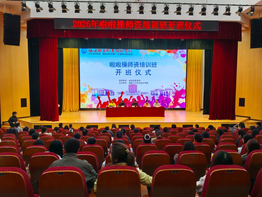 闽侯县教育局体卫艺科科长胡晨锦、福建师范大学体育科学学院教授暨啦啦操金牌导师方熙嫦、我校体育部主任王钝锐、继续教育学院院长何烜出席开班仪式。