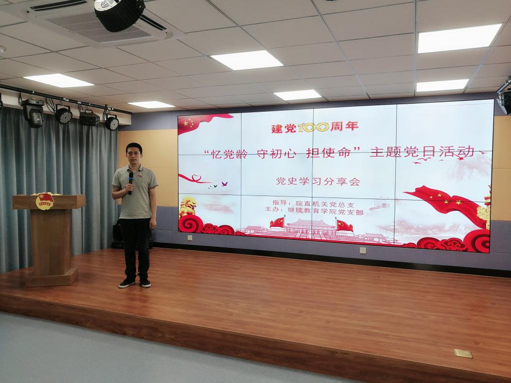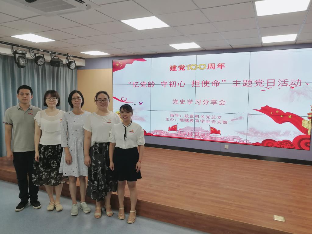 为进一步推动党史学习教育深入开展,讲好红色故事,传承红色基因。6月18日,继续教育学院党支部组织开展“忆党龄 守初心 担使命”党史学习分享会主题党日活动,共同回顾风云激荡的革命岁月,鼓励全体党员传承红色基因,用党的奋斗历程和伟大成就鼓舞斗志、明确方向、坚定信念、凝聚力量,共同感受中国共产党100年来奋发图强、砥砺前行的峥嵘岁月。活动由继续教育学院党支部书记何烜主持。院直机关党总支委员代表和继续教育学院党支部全体党员共9位党员同志参加了本次活动。