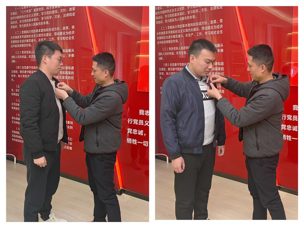宣誓结束后,何烜为新党员佩戴党员徽章,对光荣加入中国共产党的新党员们表示热烈祝贺。他指出,加入党组织是人生新的起点、新的开始,要真正成为合格的、优秀的共产党员,还有很长的路要走。他对新党员提出三点希望:一是希望大家筑牢思想根基,强化理论武装,做一名真正的马克思主义者;二是希望牢记入党誓词,自觉遵守党的章程,不忘入党初心;三是希望大家把党员先进性目标与自己的本职工作紧密结合起来,在工作中充分发挥党员的先锋模范作用。