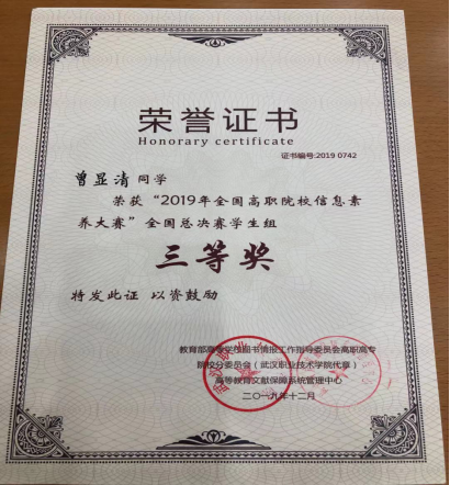 为迎接中华人民共和国成立70周年,弘扬“不忘初心、牢记使命”、爱岗敬业、无私奉献精神,12月4日,由管理系第二党支部支委张眉芳老师及图书馆张丽萍老师指导,第二支部入党积极分子曾显清同学获得首届全国高职院校信息素养大赛全国总决赛三等奖。