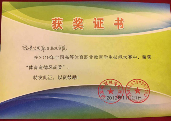 11月22日,全国高等体育职业教育学生技能大赛在美丽的海滨城市珠海落下帷幕,我校管理系体育保健与康复专业3名选手组成代表队荣获“体育道德风尚奖”。参赛选手18级体育保健与康复专业301班杨浩、郑凤龙、刘雪琴荣获“健身指导技能”比赛团体三等奖。