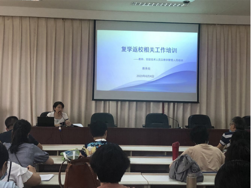随后,朱扶蓉处长分别从学生错峰返校及教学安排、分批次返校教室安排、复课证明查验制度、课堂突发情况处置、疫情防控期间实训室管理等五个方面进行了详细的讲解与培训,强调各位教师、实验技术人员及教学管理人员根据疫情防控要求,遇到突发事件时主动报告,按处置流程规范处理,相关部门及时做好后续消杀工作。