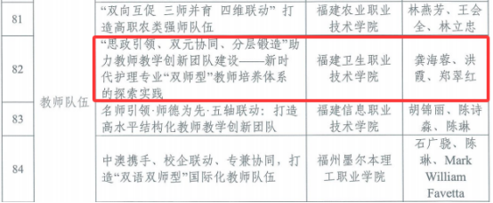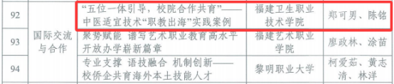 近日,福建省职业技术教育中心公布了2025年全省职业教育改革发展典型案例名单,我校报送的《思政引领、双元协同、分层锻造”助力教师教学创新团队建设——新时代护理专业“双师型”教师培养体系的探索实践》(公共卫生与健康管理学院)、《五位一体引导,校院合作共育”——中医适宜技术“职教出海”实践案例》(医学院)2个案例分别入选“教师队伍”、“国际交流与合作”类型典型案例。