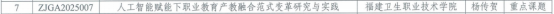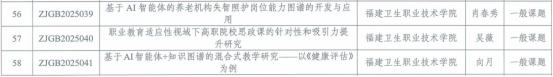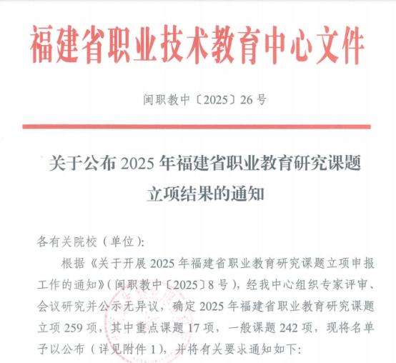 近日,福建省职业技术教育中心公布了2025年福建省职业教育研究课题立项结果,我校杨传贺主持的《人工智能赋能下职业教育产教融合范式变革研究与实践》(重点选题)、肖春秀主持的《基于AI智能体的养老机构失智照护岗位能力图谱的开发与应用》(一般课题)、吴薇主持的《职业教育适应性视域下高职院校思政课的针对性和吸引力提升研究》(一般课题)和向月主持的《基于AI智能体+知识图谱的混合式教学研究——以<健康评估>为例》(一般课题)四项课题获批立项。