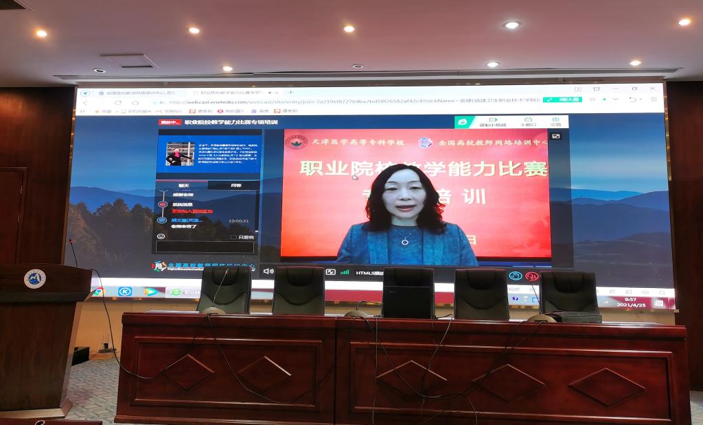 为贯彻落实全国职业教育大会精神和《国家职业教育改革实施方案》,更好地备战2021年教师教学能力大赛,并将教学能力比赛的成果应用到实际教学中,以切实提升教学能力水平,4月25日,我校教务处组织全校教师在实训楼四楼报告厅观看由天津医学高等专科学校和全国高校教师网络培训中心共同举办的“职业院校教学能力比赛专项培训”直播。