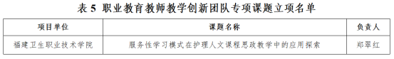 近日,福建省职业技术教育中心公布了2022年福建省职业教育研究课题立项结果,我校三项课题喜获立项。其中,朱扶蓉教授主持的《医药卫生类高职院校多主体协同的立德树人落实机制研究》和唐青副教授主持的《O-PT-RCS-CA翻转课堂模式在<信息技术基础>中的应用》两项课题获批“职业教育教学改革研究常规课题”立项,郑翠红教授主持的《服务性学习模式在护理人文课程思政教学中的应用探索》获批“职业教育教师教学创新团队专项课题”立项。