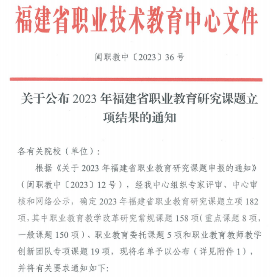 近日,福建省职业技术教育中心公布了2023年福建省职业教育研究课题立项结果,我校三项课题喜获立项。其中,黄铭珊副教授主持的《职业教育资源与区域重要产业匹配实践路径研究——以医学检验技术专业群与IVD产业匹配为例》和郑梅钦老师主持的《健康中国背景下高职学生心理危机干预体系构建研究》两项课题获批“职业教育教学改革研究常规课题”立项,龚海蓉教授主持的《高职护理专业教师“课程思政”改革认知与期望的质性研究》获批“职业教育教师教学创新团队专项课题”立项。