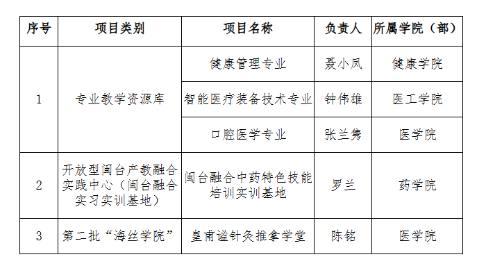 根据《福建省教育厅关于开展2024年省级职业教育重点建设项目申报和验收工作的通知》(闽教职成〔2024〕15号),经各学院(部)推荐申报,学校教学委员会审议通过,拟同意推荐健康学院聂小凤老师主持的“健康管理专业教学资源库”等3个项目申报福建省职业教育专业教学资源库、医学院陈铭老师负责的“皇甫谧针灸推拿学堂”申报福建省高职院校第二批“海丝学院”、药学院罗兰老师负责的“闽台融合中药特色技能培训实训基地”申报福建省高职院校开放型闽台融合实习实训基地。详见附件。
