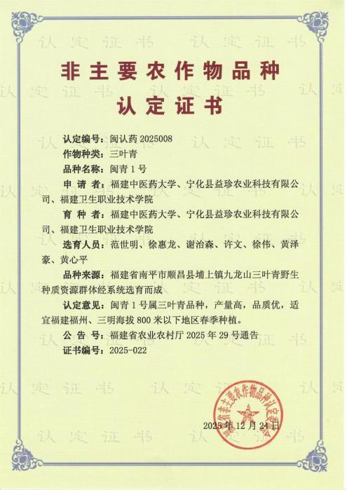 “闽青1号”由南平市顺昌县野生三叶青资源经多年系统选育而成。经实验验证,该品种高产优质,其醇浸出物、总多糖、总黄酮等关键有效成分含量均显著优于野生种,具备极高的推广价值。它的育成,不仅能助力福建省三叶青主产区提质增效,有效缓解市场原料供需缺口,更为我国中药资源的可持续开发提供了坚实的福建方案。