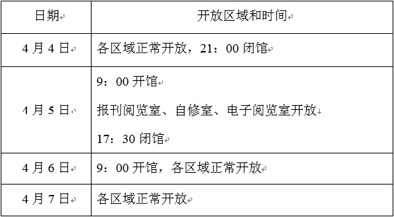 清明节放假期间,图书馆开放时间调整如下:
