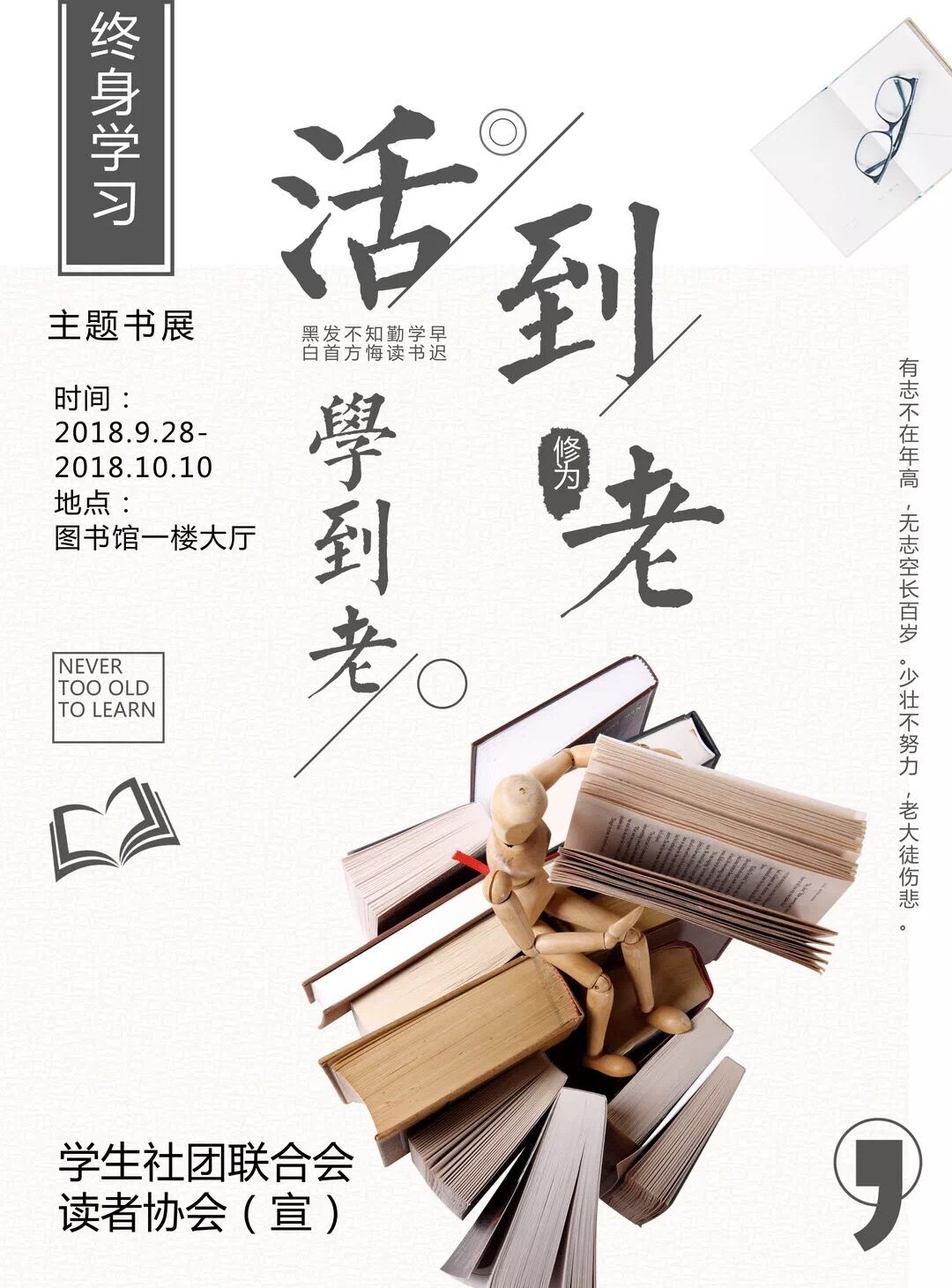 在“全民终身学习活动周”来临之际,图书馆特举办“活到老、学到老”主题书展,精选各类好书百余册在图书馆一楼大厅进行展示,持续时间为2018年9月28日至10月10日,欢迎师生读者前来借阅。