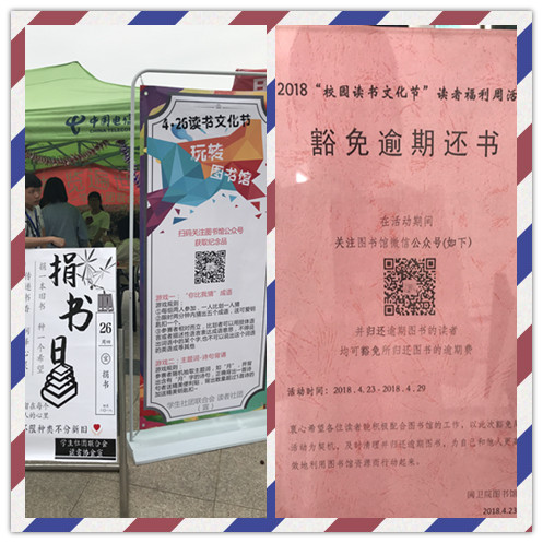 读者协会在捐书区号召并接收全院师生捐赠的图书,更有“读书福利周”——全部归还超期图书可豁免罚款、图书漂流等活动。