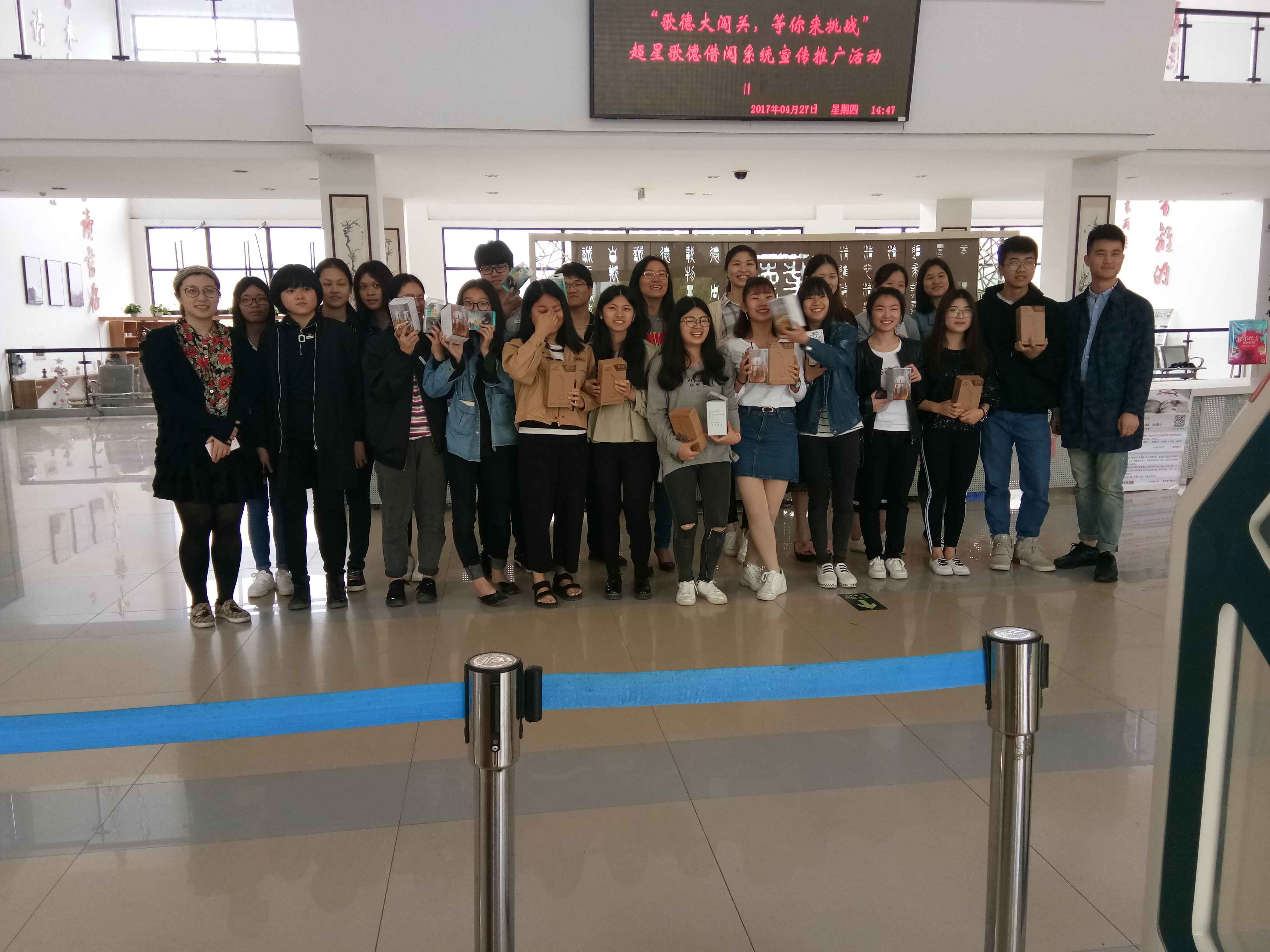 2017年4月27日下午,图书馆在一楼大厅举办了世界阅读日系列活动之“歌德大闯关 等你来挑战”歌德借阅系统宣传推广活动,60余名读者在现场参加了活动。