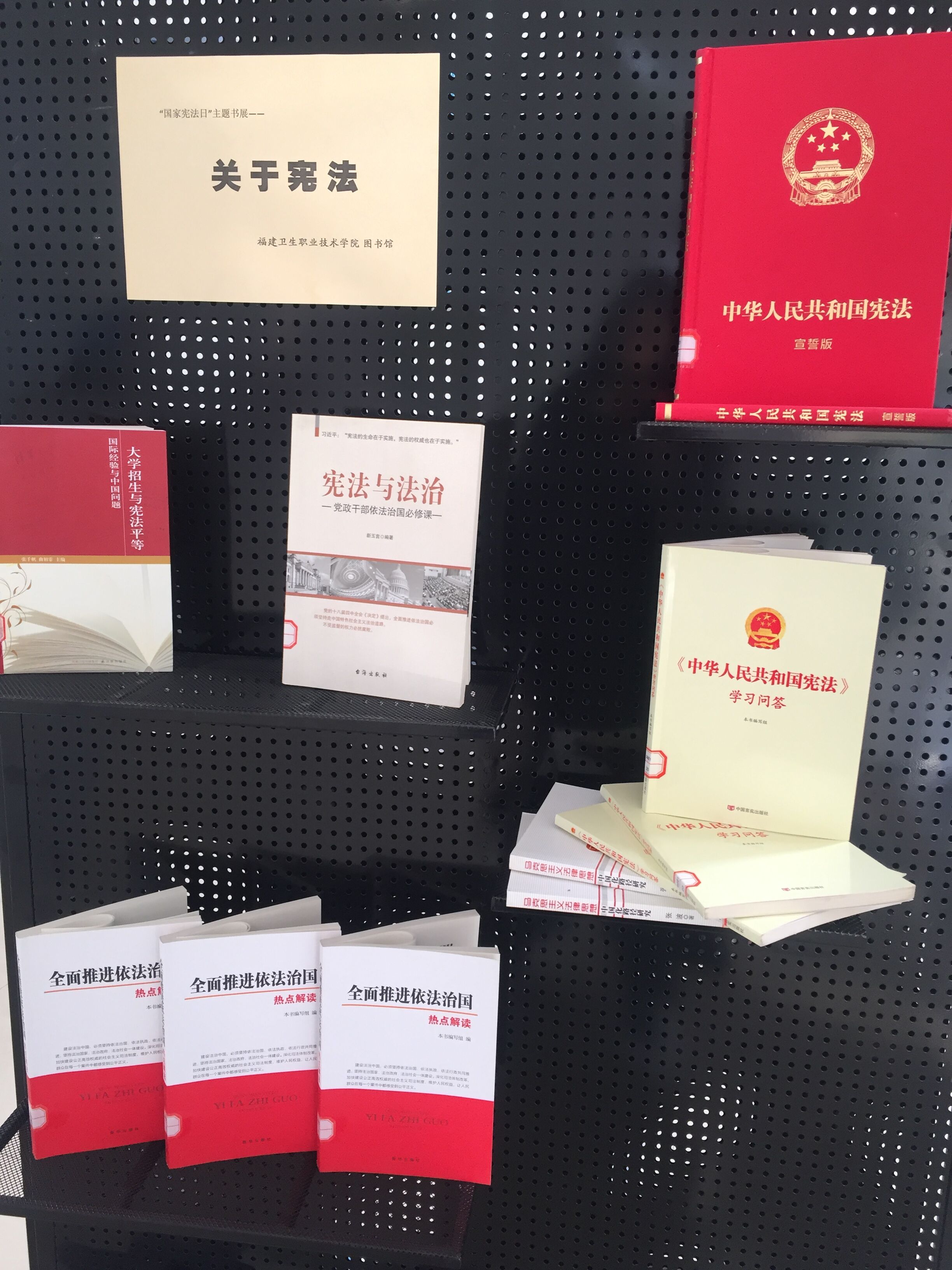 为深入贯彻落实党的十九大精神,在全院普及宪法知识、加强宪法教育、弘扬宪法精神,积极推进学院“七五”普法教育工作,图书馆在一楼大厅举办“国家宪法日”普法主题书展,展期从12月2日——12月22日。