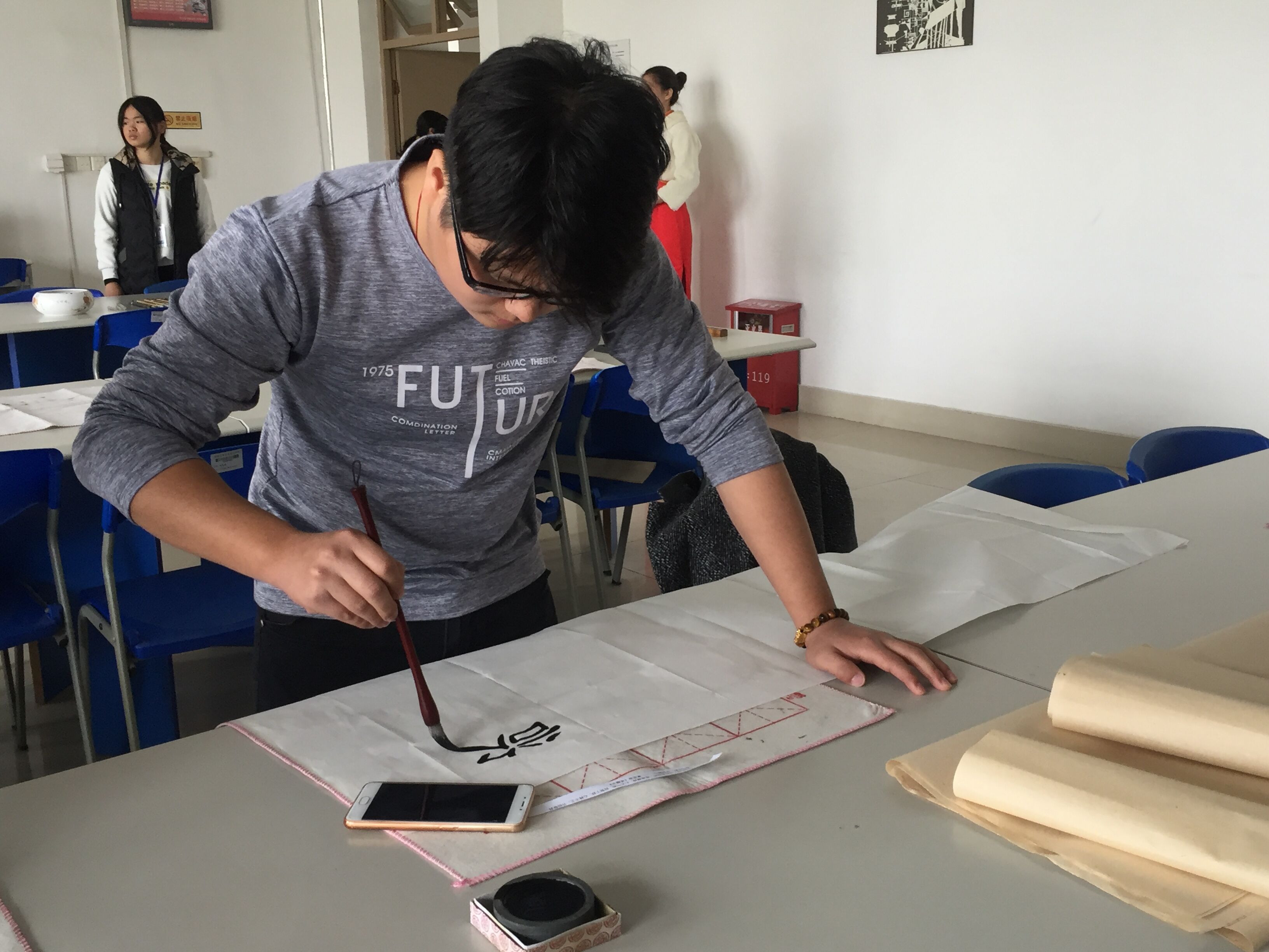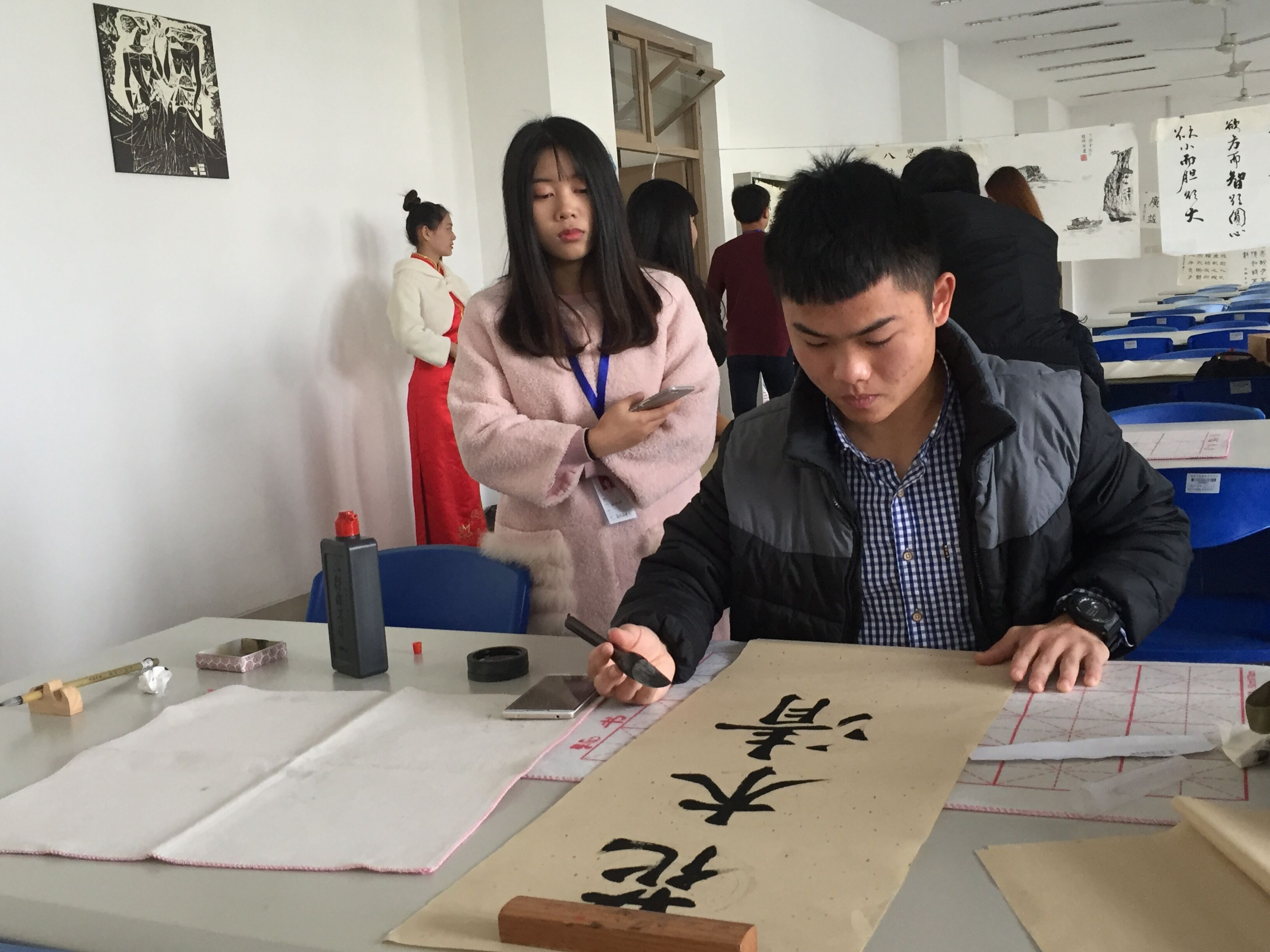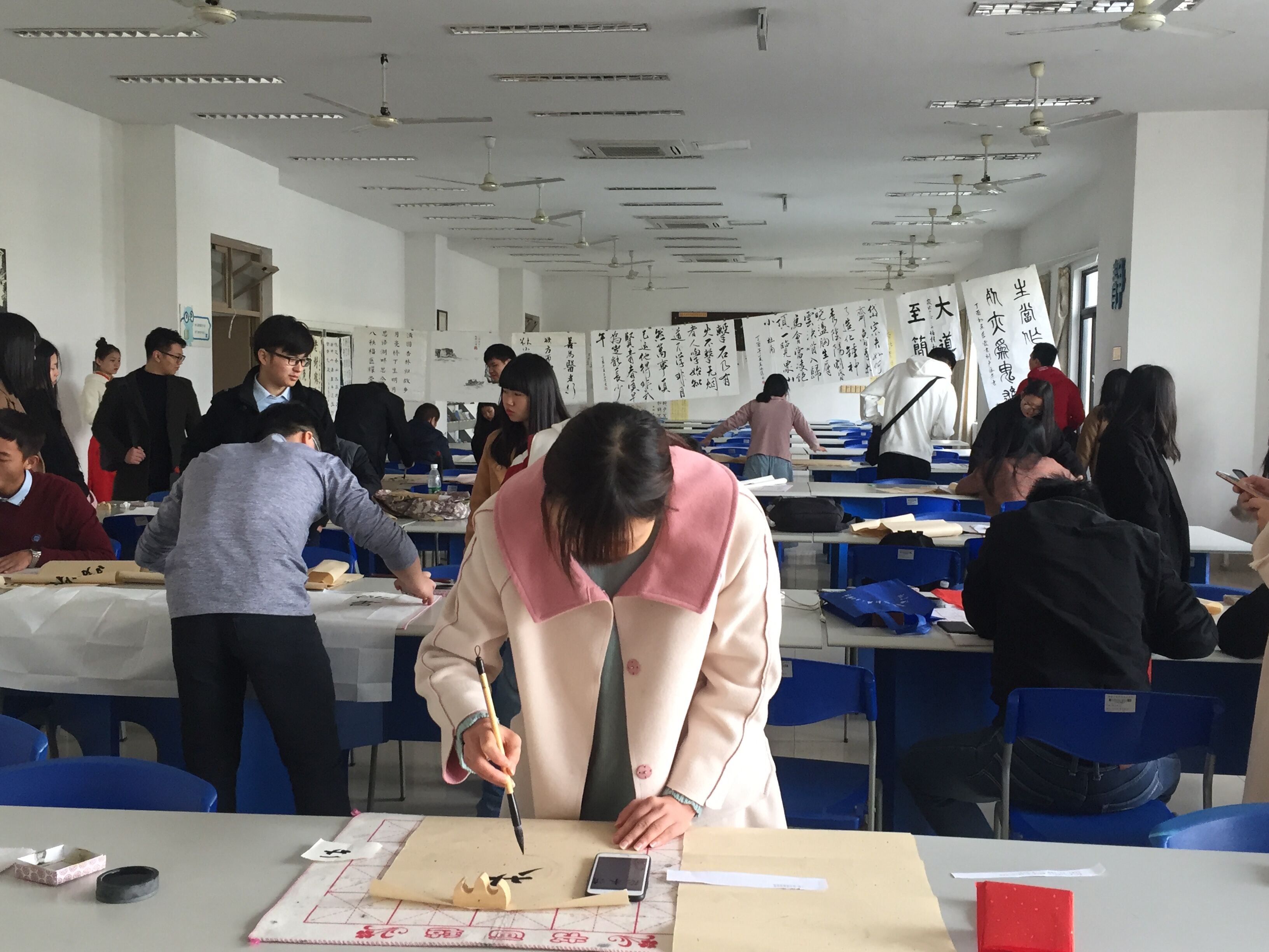 上午九时许,活动正式开幕。随后,书画比赛在大厅旁的阅览室内进行,现场墨香四溢。比赛分为软笔硬笔组、软笔组和绘画组,共有来自校内外三十余名书画爱好者参加了比赛。经过三个多小时精心地创作,参赛选手都呈交了自己满意的作品,这些作品将在近期经专家评审后评出奖项并公布。