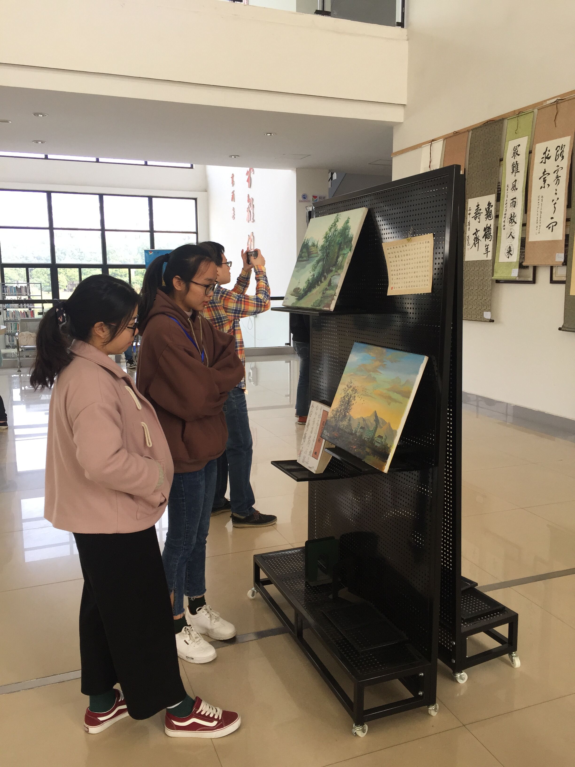 在比赛进行的同时,往届书画大赛的优秀作品近百幅也在图书馆一楼大厅展出。参展作品题材广泛,包括软笔、硬笔、国画、水粉、素描,内容包括唐诗宋词、传统谚语、名言警句等,彰显出当代大学生深厚的传统文化底蕴,为我院校园增添了一抹浓重的古韵书画风。本次书画展将在图书馆持续展出至2018年1月10日,欢迎校内师生前来鉴赏。