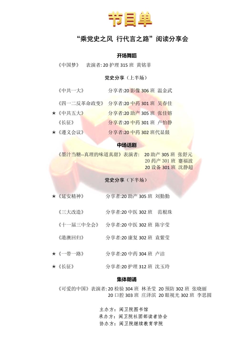 11位学生通过阅读“中共一大”、“四一二反革命政变”、“中共五大”、“红军长征”、“遵义会议”、“延安精神”、“社会主义三大改造”、十一届三中全会、“ 港澳回 归”、“一带一路”等党史事件的相关书籍,分享自己的阅读感悟。
