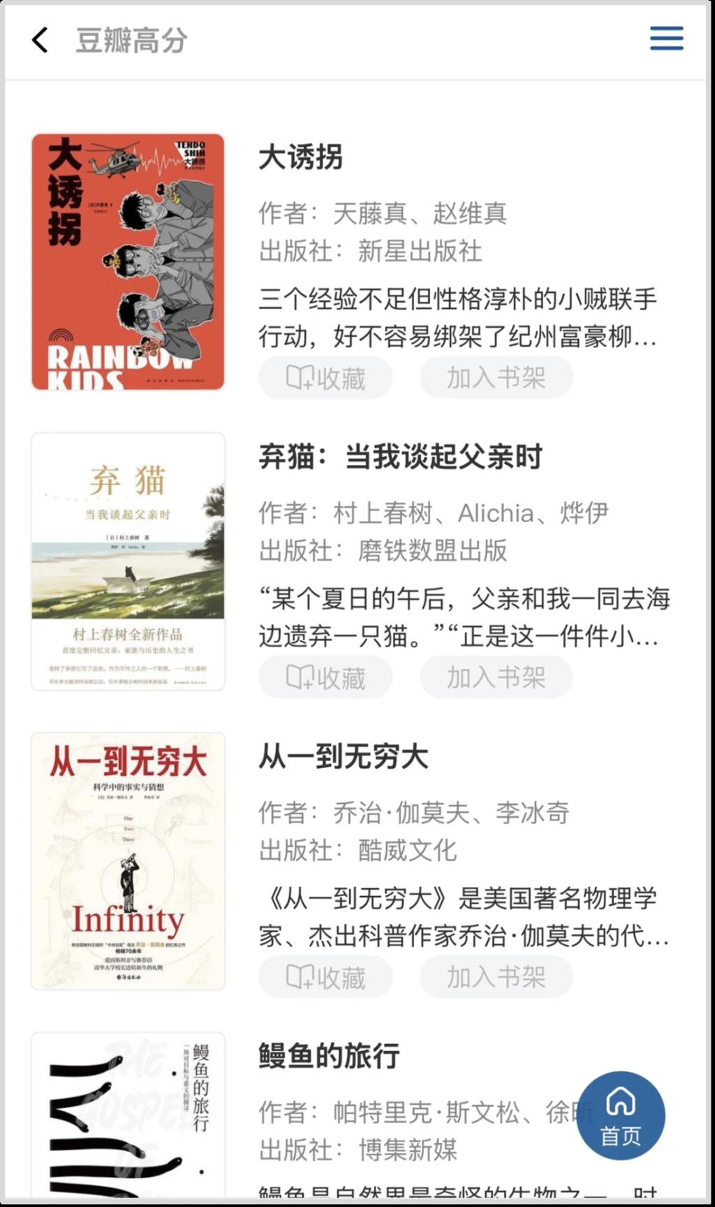 除经典典籍图书以外,平台紧跟社会热点与大众阅读趋势,收录畅销文学作品、影视原著、新书速递、豆瓣好书等。