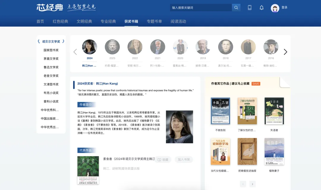 平台收录诺贝尔文学奖、茅盾文学奖、鲁迅文学奖等多项全球顶尖文学殿堂级的图书作品。