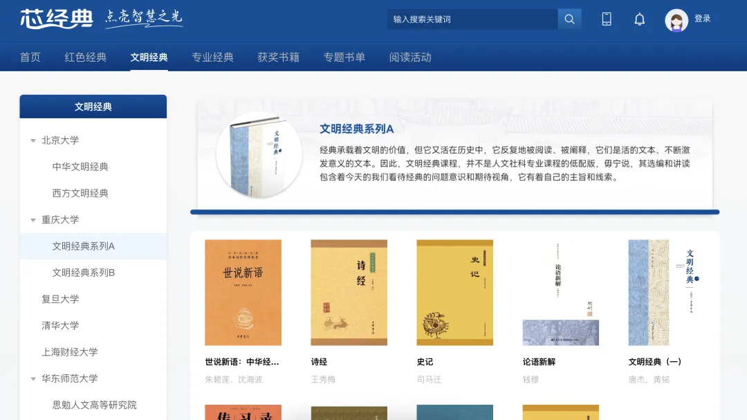 与多个通识教育学院和文学院等合作,由专家团队梳理并推荐适合学生阅读的文明经典著作。