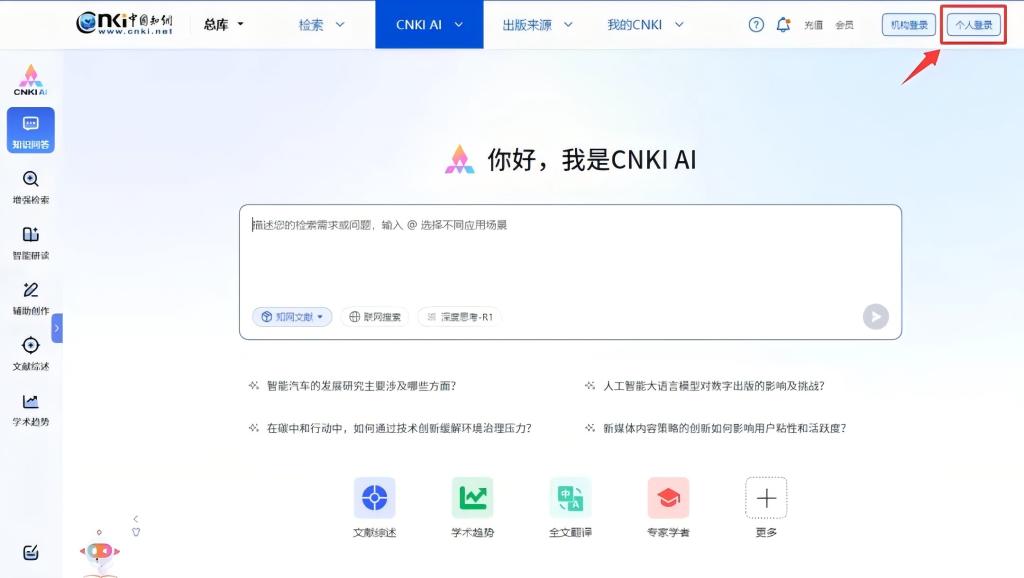 1.在“中国知网”数据库首页点击“CNKI AI”,注册或登录个人账号;