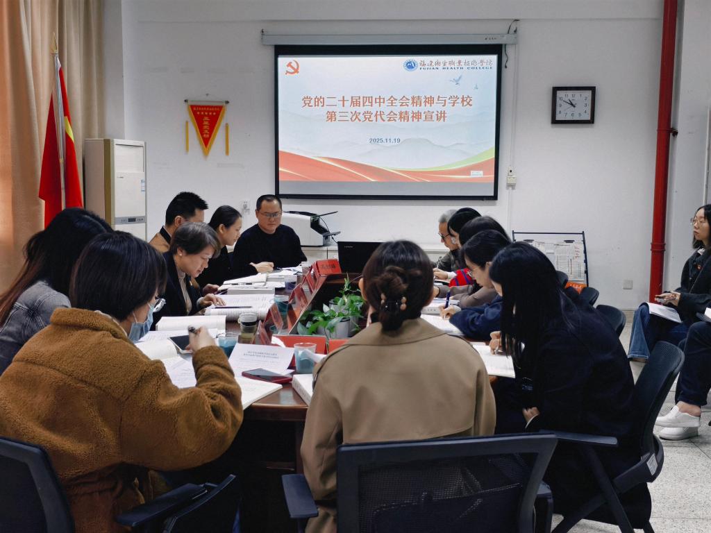 朱扶蓉指出党的二十届四中全会通过了制定国民经济和社会发展第十五个五年规划的建议,明确了以经济建设为中心,以推动高质量发展为主题,以改革创新为根本动力,以满足人民利益增长的美好生活需要为根本目的,以全面从严治党为根本保障和指导思想,为新征程指明了方向。恰逢我校第三次党员代表大会胜利闭幕,我们必须牢牢把握党代会提出的“一个根本,两个引擎,三个驱动,四个提升,五个服务”的战略任务,为谱写教育强国、教育强省、健康中国、健康福建的崭新篇章而努力奋斗。
