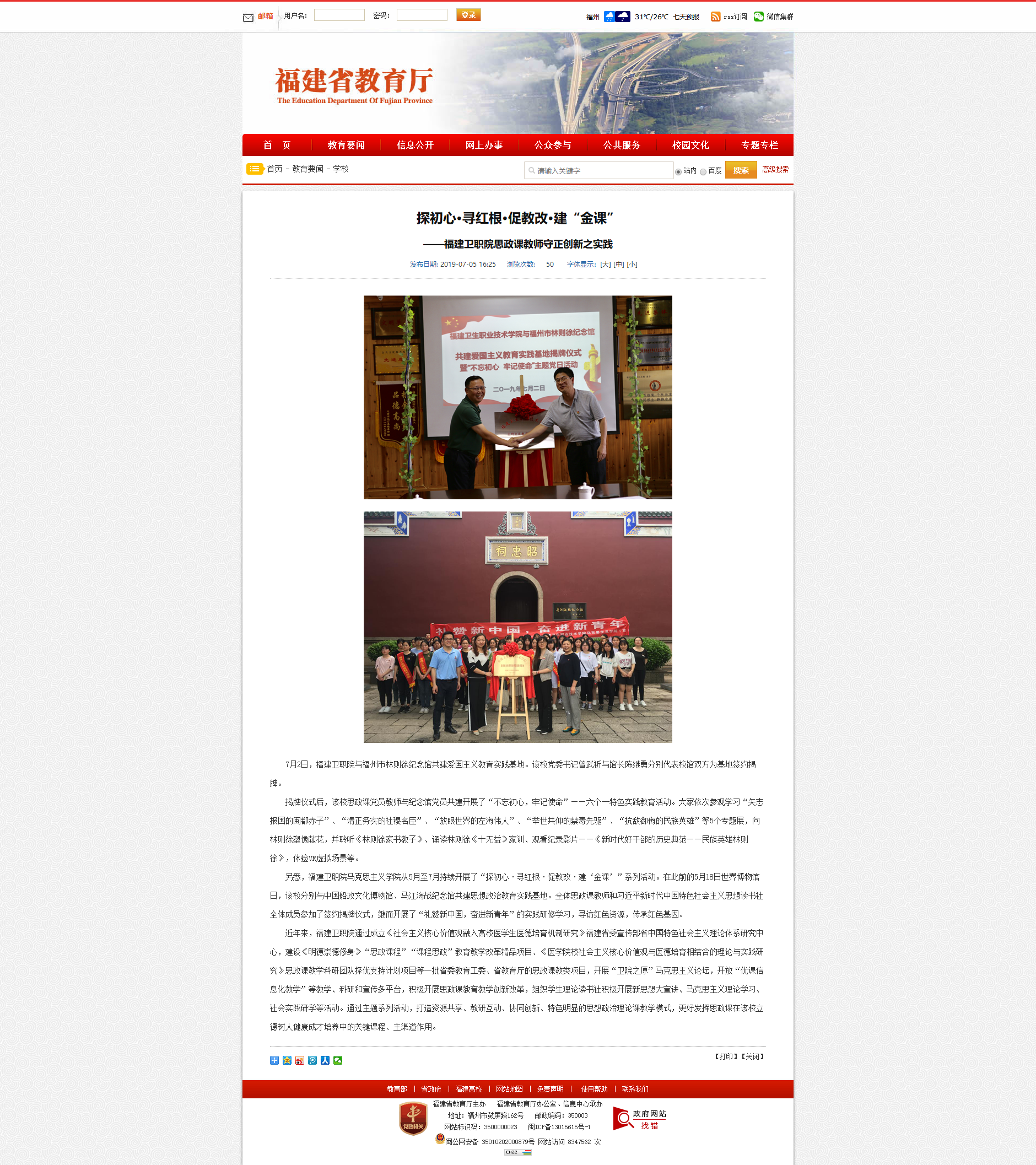 我校此次的主题系列活动得到了福建省教育厅媒体报道。后续,我校将会继续在思政课改革方面下力气,打造资源共享、教研互动、协同创新、特色明显的思想政治理论课教学模式,更好发挥思政课在该校立德树人健康成才培养中的关键课程、主渠道作用。