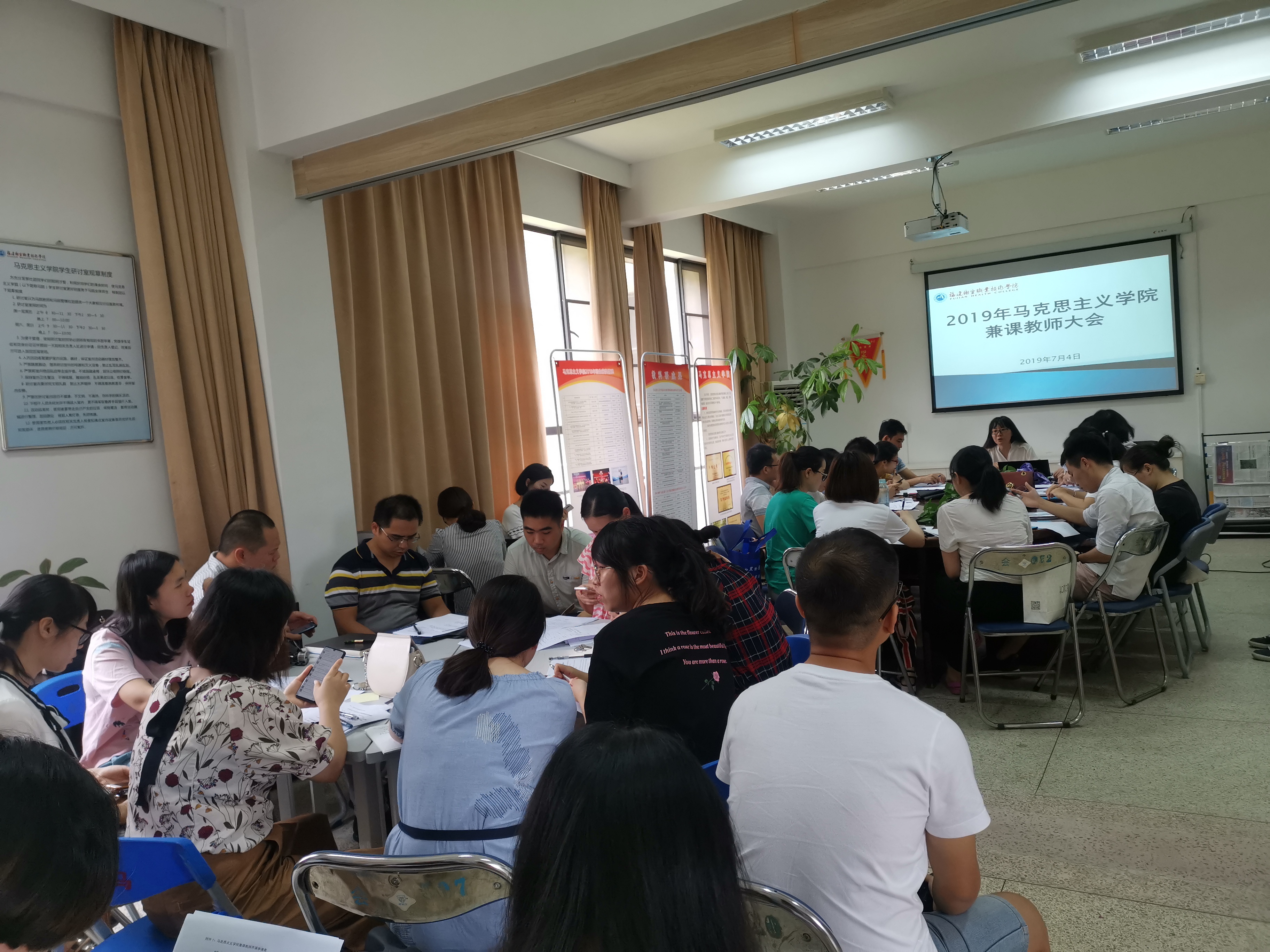 为全面提升教师教学质量,贯彻落实习近平总书记在学校思政课教师座谈会重要讲话精神,用好课堂教学这个主渠道,使马克思主义学院(以下简称“马院”)教学工作逐步走向制度化、规范化和科学化的轨道,更上一个台阶。2019年7月4号上午在行政楼107召开马院全体兼课教师大会,马院院长熊美兰主持会议。