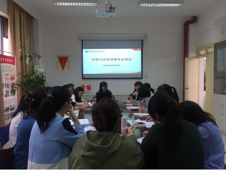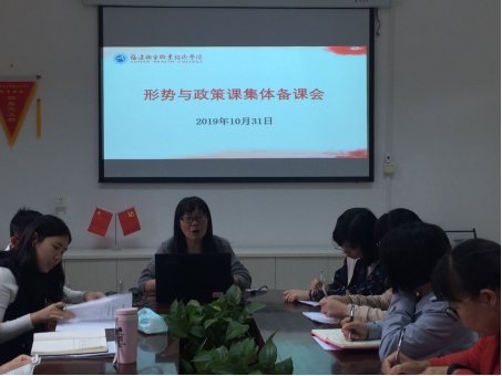 为了进一步实落细集体备课精神,切实提高教师的专业素养和教学能力,继续提升课堂教学质量,2019年10月31日上午,形势与政策教研室在行政楼107室召开集体备课专题会。本次会议由形势与政策教研室主任丁爱芝主持,马克思主义学院院长熊美兰、形势与政策教研室全体教师参加了备课会。